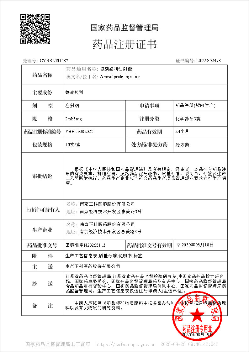 2025年8月19日,正科醫(yī)藥喜獲氨磺必利注射液生產(chǎn)批件,證書編號(hào):2025S02478,藥品批準(zhǔn)文號(hào):國(guó)藥準(zhǔn)字H20255113,規(guī)格:2ml:5mg。適應(yīng)癥為:預(yù)防成人術(shù)后惡心和嘔吐(PONV),可單獨(dú)使用或與不同類別的止吐藥物聯(lián)用。