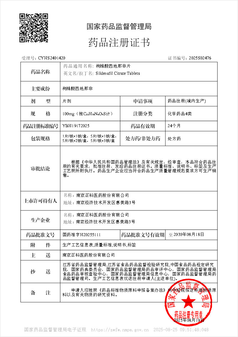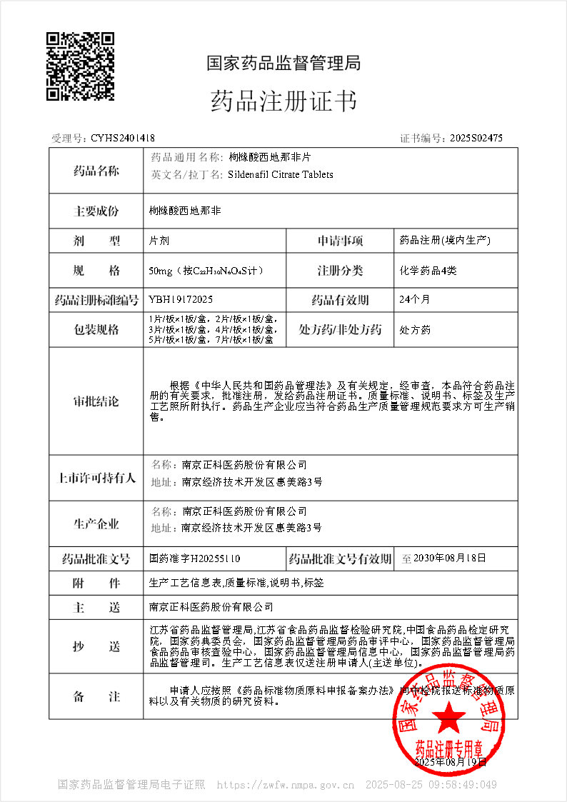 繼氨磺必利注射液獲批上市,2025年8月19日,正科醫(yī)藥又喜獲枸櫞酸西地那非片生產(chǎn)批件,此次3個(gè)規(guī)格的產(chǎn)品同時(shí)獲批: