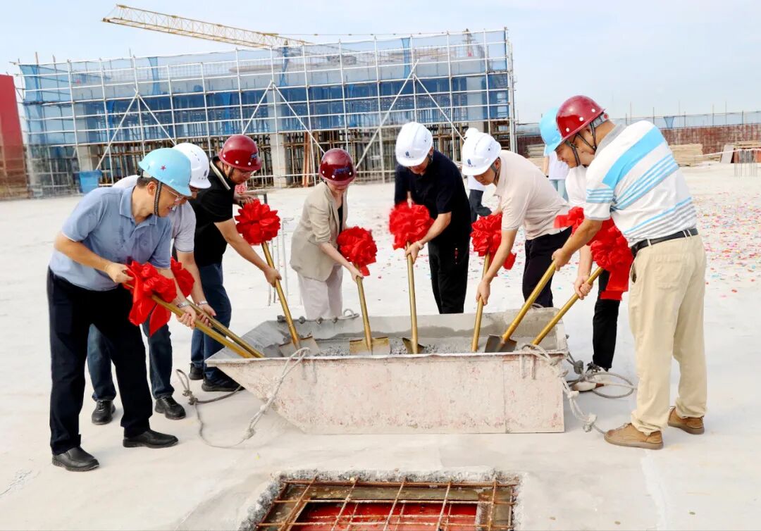 在熱烈的氛圍中,公司領(lǐng)導(dǎo)與施工單位代表一同手持鐵鍬,將象征圓滿的最后一方混凝土穩(wěn)穩(wěn)澆筑至樓頂。頃刻間,禮炮聲、掌聲、歡呼聲匯聚成熱烈的交響樂,每一份喜悅都承載著對(duì)新基地未來的無限期待。“金頂喜封耀云端,基業(yè)長(zhǎng)青永流傳”,隨著混凝土順利落定,這場(chǎng)凝聚著眾人心血的封頂儀式,圓滿禮成。