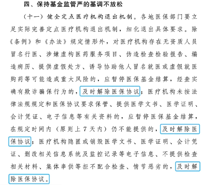 除《醫(yī)療保障基金使用監(jiān)督管理?xiàng)l例》和《醫(yī)療機(jī)構(gòu)醫(yī)療保障定點(diǎn)管理暫行辦法》規(guī)定情形外,《通知》還點(diǎn)名了三類應(yīng)及時(shí)解除醫(yī)保協(xié)議的行為,包括醫(yī)療機(jī)構(gòu)涉嫌虛構(gòu)醫(yī)藥服務(wù)項(xiàng)目、偽造檢查檢驗(yàn)報(bào)告、編造病歷、提供虛假處方等。